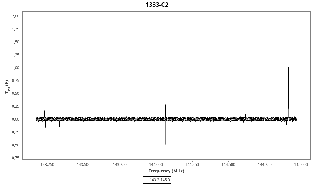 | Tmb (K) | Width (km/s) | I (K km/s) | Vlsr (km/s) | Obs. freq (MHz) | Rest freq (MHz) | S/N ratio | Transition | Reduced spectrum | Original spectrum |