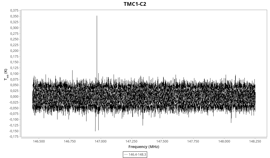 CAUTION: Do not trust in wide lines (line width > 2 km/s) that might be due to baseline problems and/or atmospheric lines. Do not trust in “exotic” line identifications that are more likely due to a spurious match with the line catalogue.