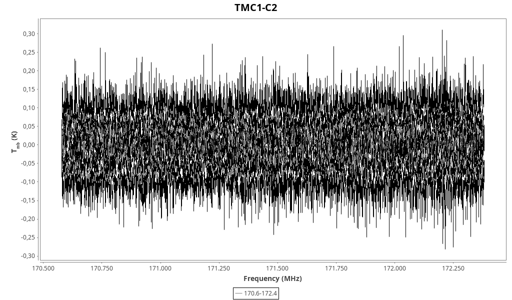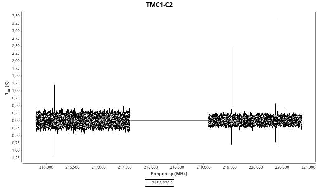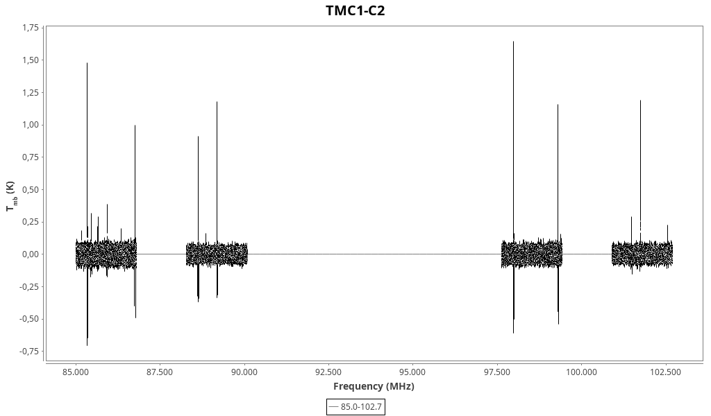 CAUTION: Do not trust in wide lines (line width > 2 km/s) that might be due to baseline problems and/or atmospheric lines. Do not trust in “exotic” line identifications that are more likely due to a spurious match with the line catalogue.