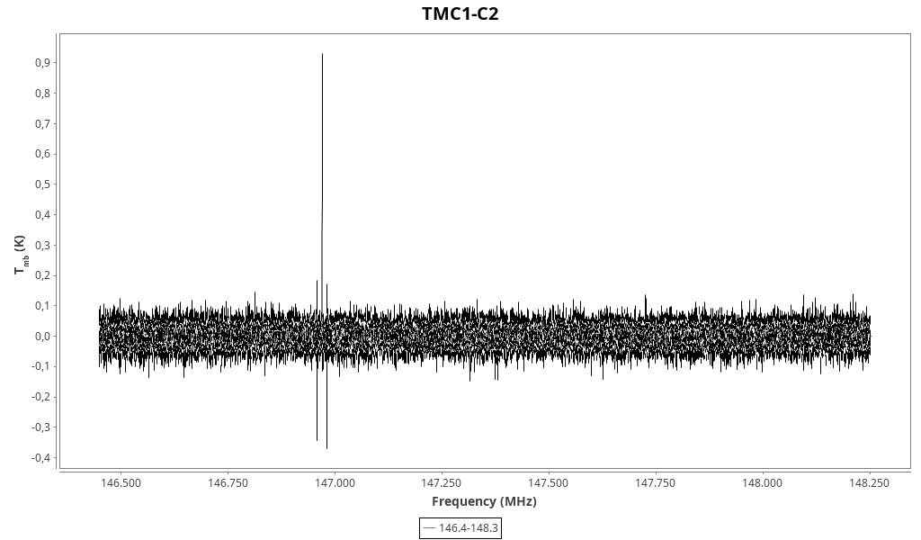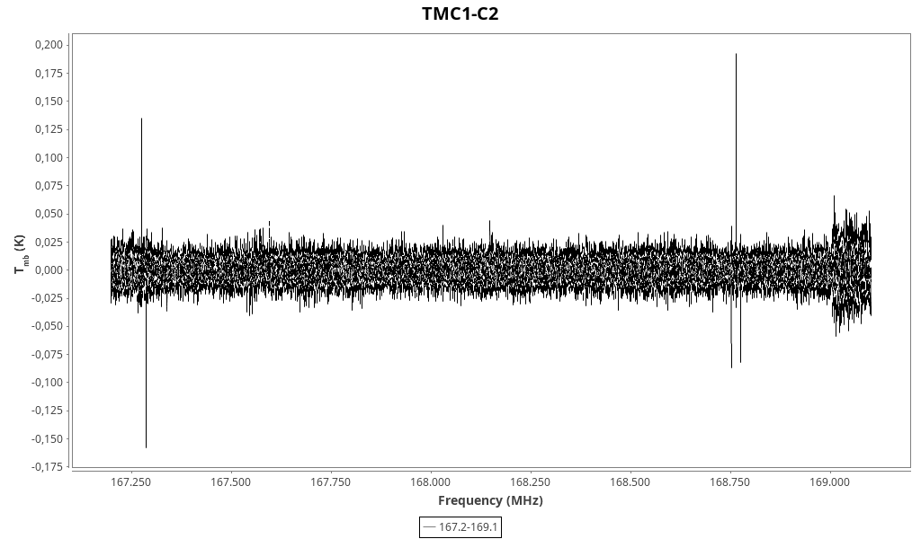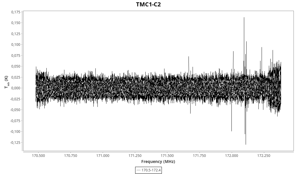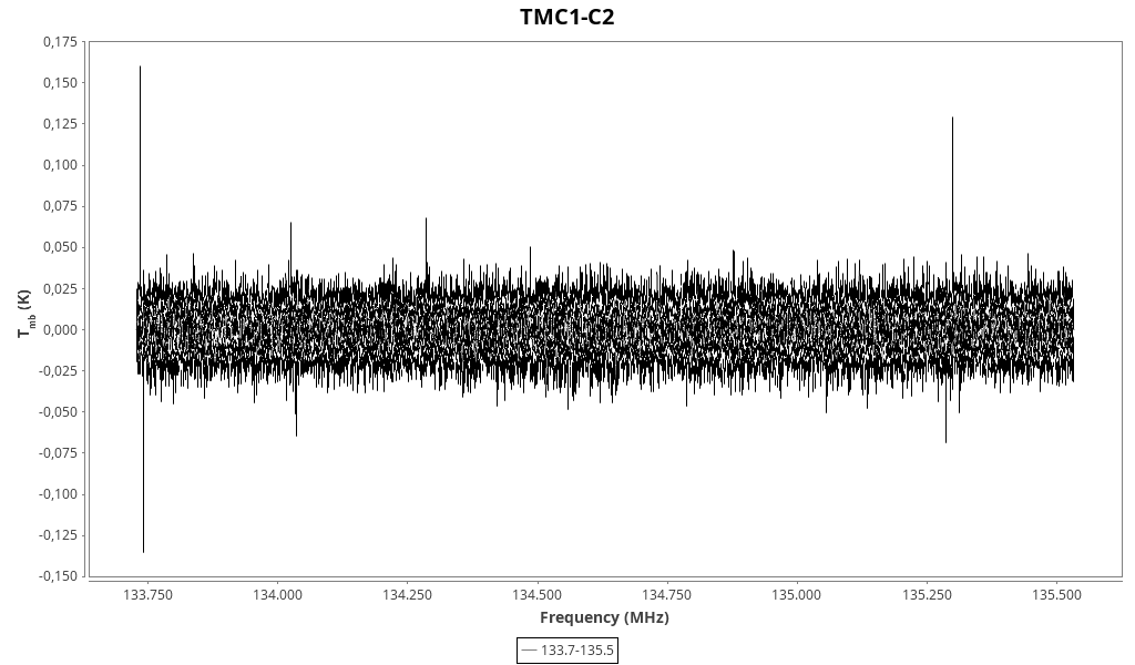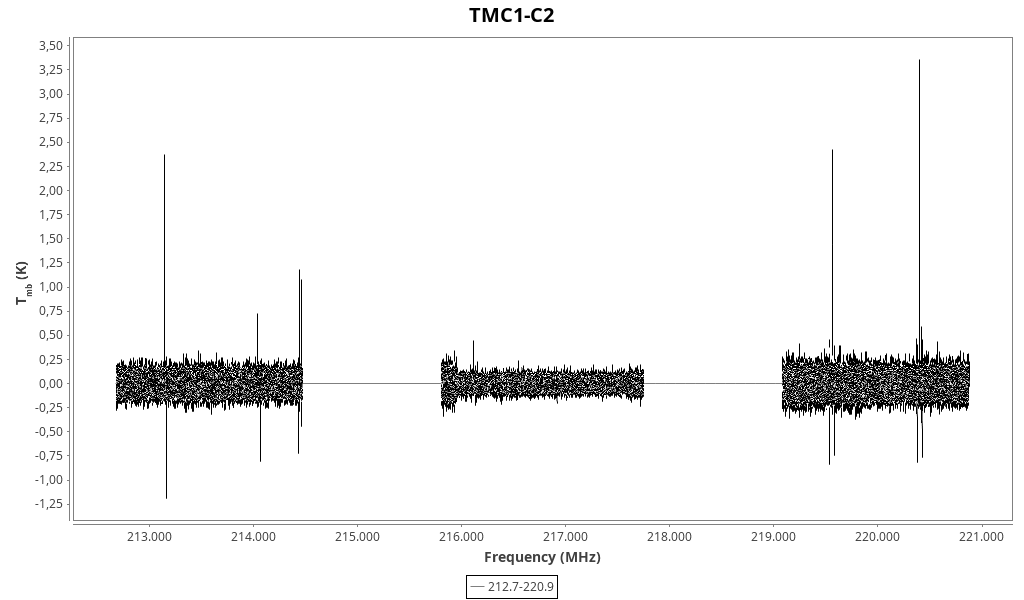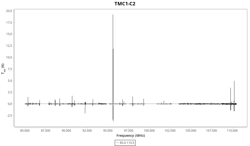 CAUTION: Do not trust in wide lines (line width > 2 km/s) that might be due to baseline problems and/or atmospheric lines. Do not trust in “exotic” line identifications that are more likely due to a spurious match with the line catalogue.