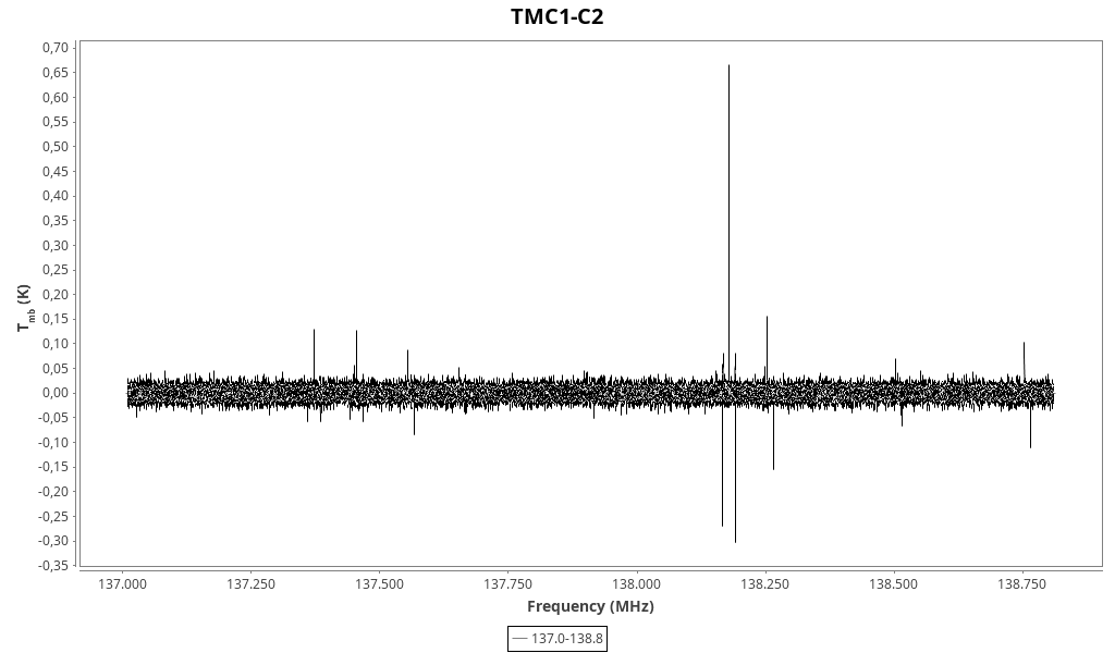 | 0.665 (0.013) | 0.060 (0.014) | 0.043 (0.009) | 5.29 (0.06) | 138254.01 | 138253.7 | 54.5 | Unidentified 138.254 GHz | | |