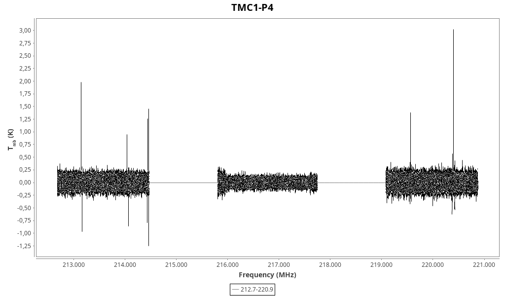 | 2.6 (0.3) | 0.10 (0.04) | 0.26 (0.11) | 5.7523 (0.0017) | 213141.09 | 213140.9 | 26.8 | Unidentified 213.141 GHz | | |