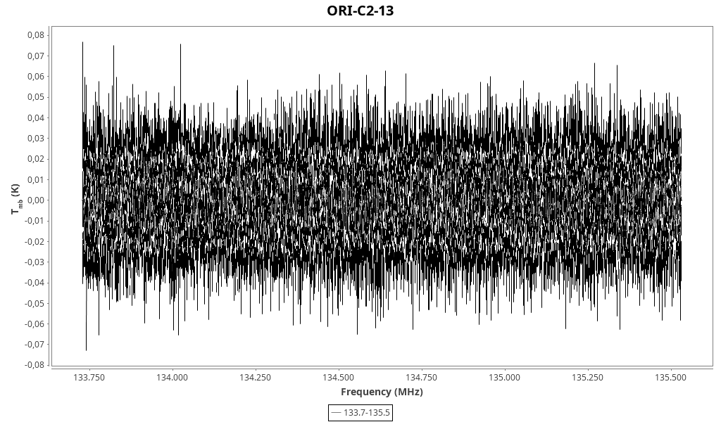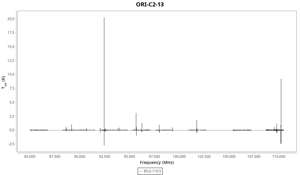 | Tmb (K) | Width (km/s) | I (K km/s) | Vlsr (km/s) | Obs. freq (MHz) | Rest freq (MHz) | S/N ratio | Transition | Reduced spectrum | Original spectrum |