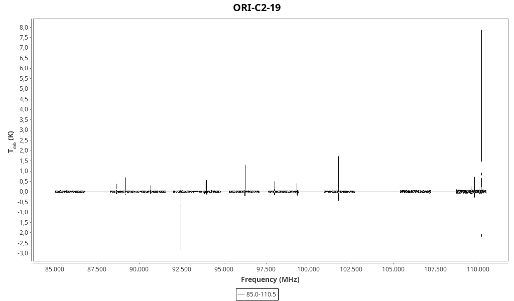 | 0.17 (0.03) | 0.8 (0.4) | 0.14 (0.06) | 9.05 (0.04) | 110202.58 | 110202.2 | 2.9 | Unidentified 110.203 GHz | | |