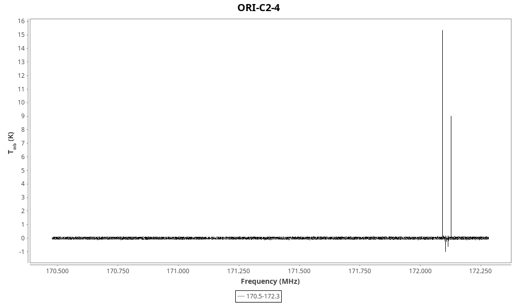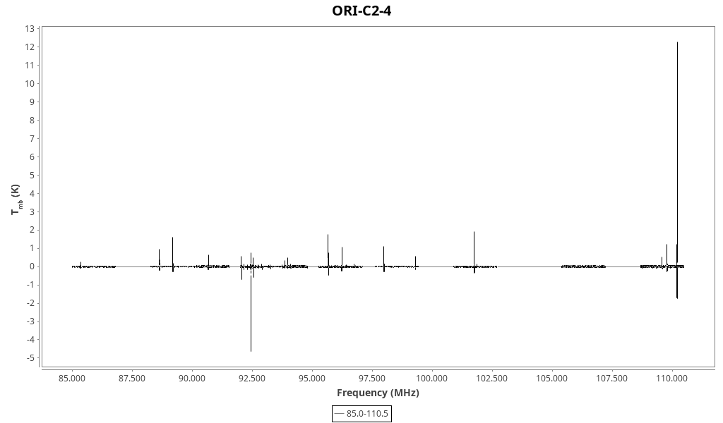 | 7.665 (0.018) | 1.695 (0.009) | 13.83 (0.06) | 8.5495 (0.0009) | 110202.33 | 110201.8 | 57.3 | Unidentified 110.203 GHz | | |