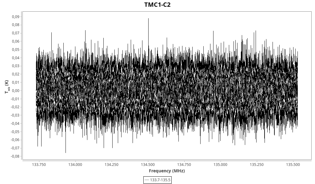 | Tmb (K) | Width (km/s) | I (K km/s) | Vlsr (km/s) | Obs. freq (MHz) | Rest freq (MHz) | S/N ratio | Transition | Reduced spectrum | Original spectrum |