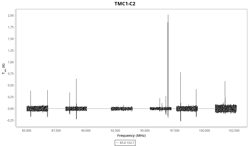 CAUTION: Do not trust in wide lines (line width > 2 km/s) that might be due to baseline problems and/or atmospheric lines. Do not trust in “exotic” line identifications that are more likely due to a spurious match with the line catalogue.