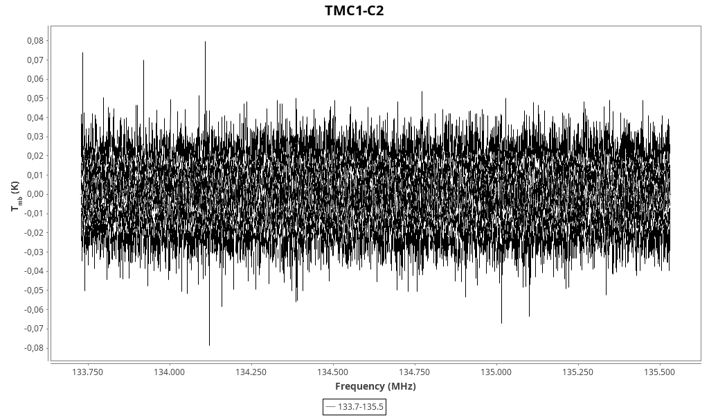 CAUTION: Do not trust in wide lines (line width > 2 km/s) that might be due to baseline problems and/or atmospheric lines. Do not trust in “exotic” line identifications that are more likely due to a spurious match with the line catalogue.